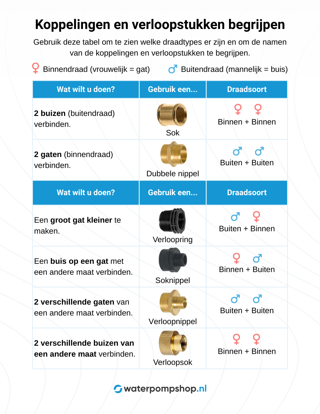 Elk hulpstuk heeft dus een eigen doel bij uw waterklus. Als u weet welke draad u heeft, kiest u altijd het juiste koppelstuk. Dit voorkomt dat u de verkeerde onderdelen bestelt voor uw project.